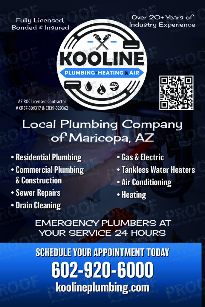 Plumbing is located near the courthouse in Maricopa. Kooline handles significant construction and residential plumbing, heating, and air conditioning services and is licensed, bonded, and insured with state certification (AZROC numbers 309317 and 329362). The owner, Moe Nazeem, is a long way from his birthplace, Fiji, which is an island nation in the South Pacific. Moe moved to Maricopa in 2010 with his wife, Farzana, who is also from Fiji. They have a young son